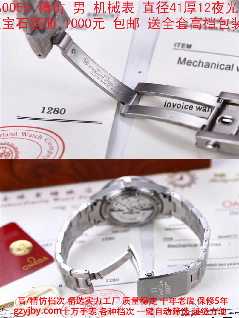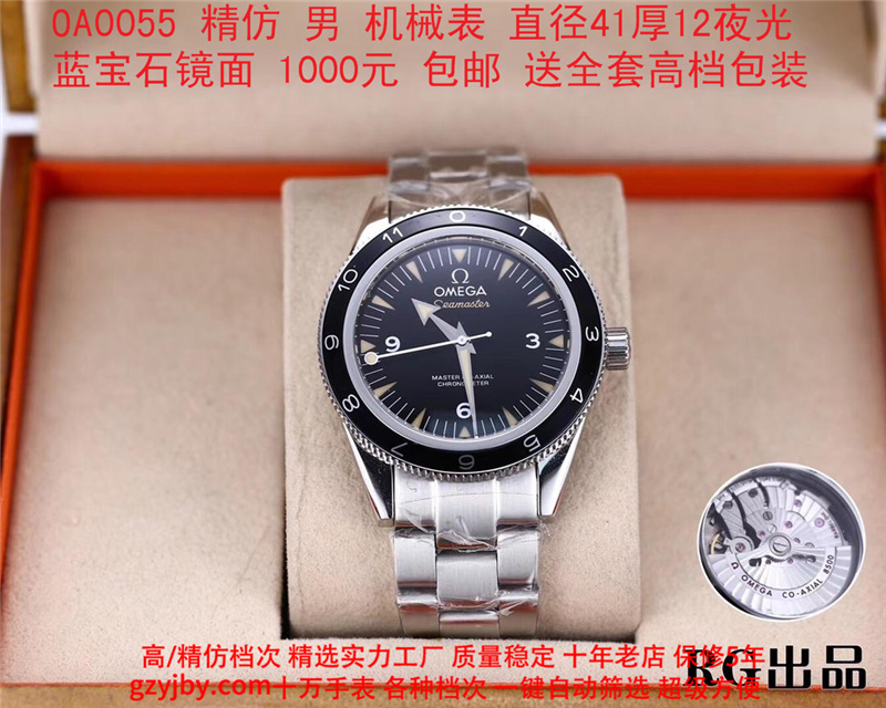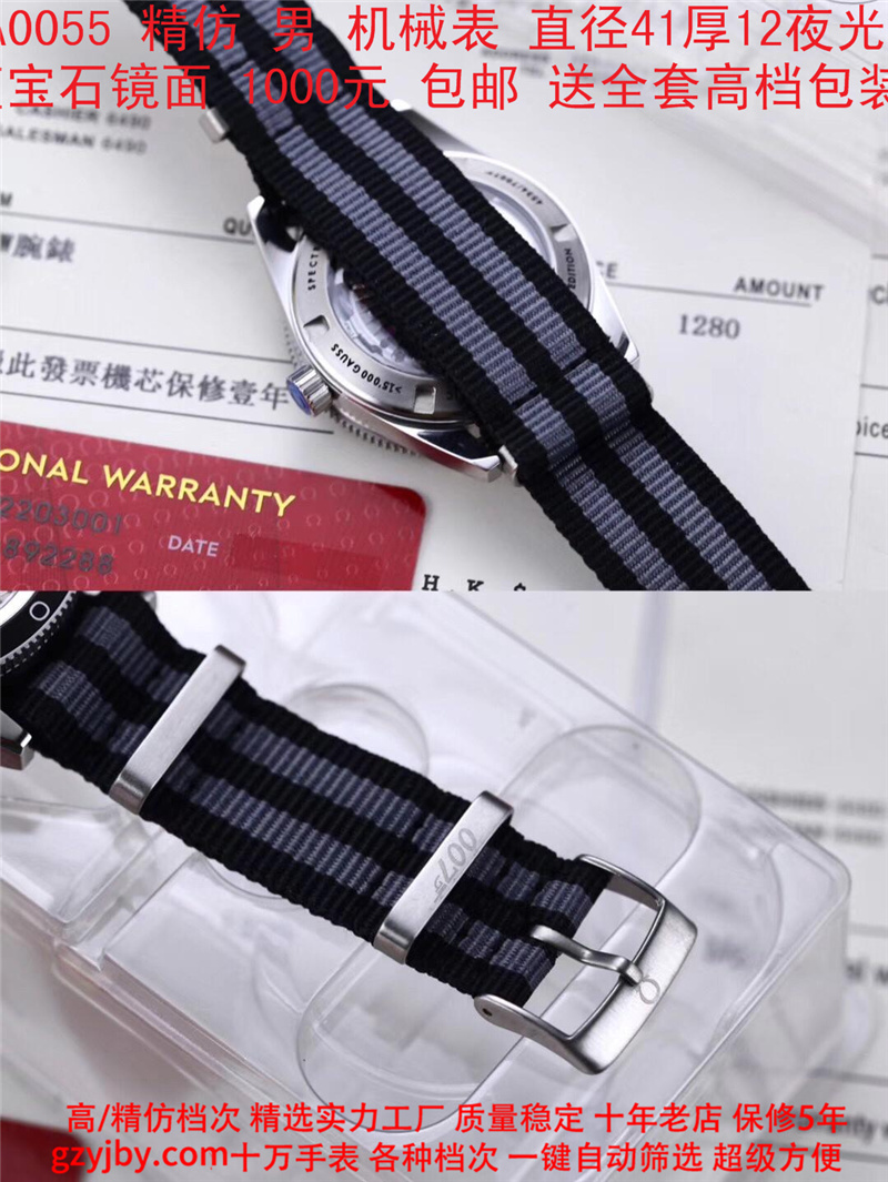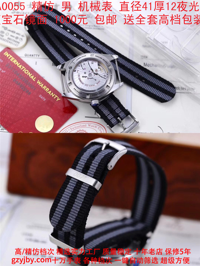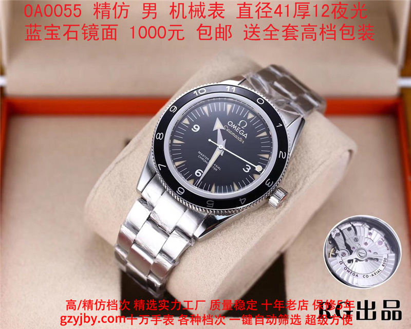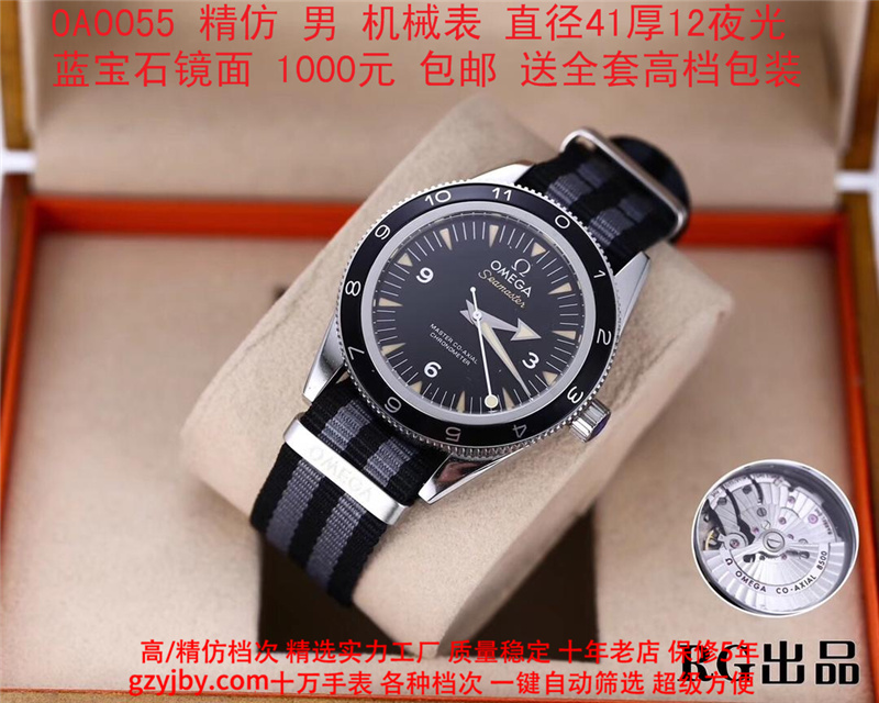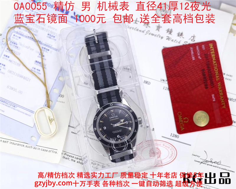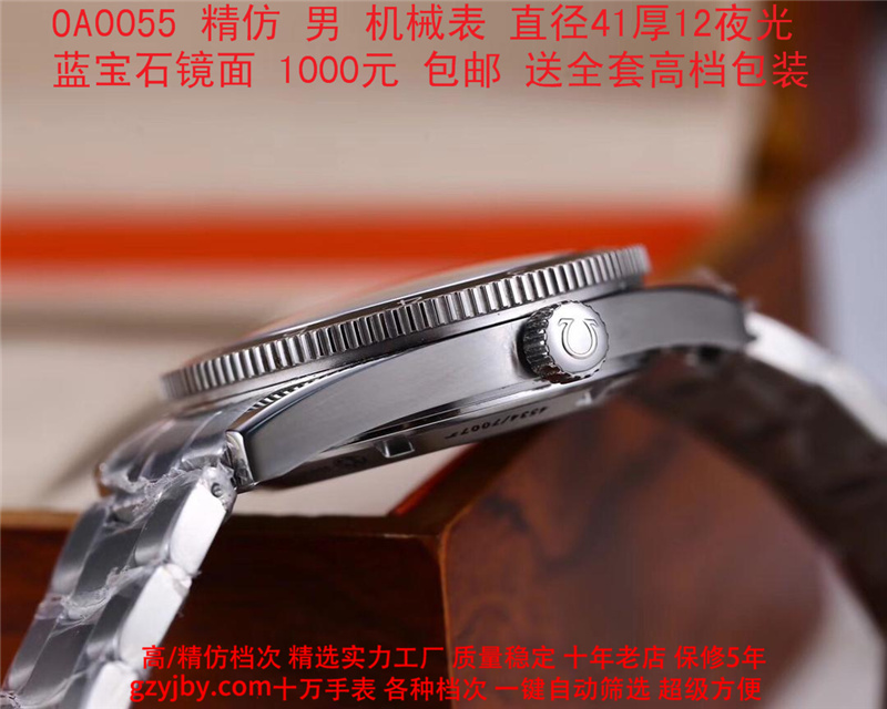 1000/个......OA0055 (正品同款 超精防 低配复刻) 欧米茄精防海马系列,男 全自动机械表, 直径41厚12毫米,夜光, 采用瑞士进口防机,蓝宝石镜面,精钢表壳,钢带或者布带, 带全套高档包装发票鉴定书等等,包邮。保修5年,质量可靠。 如需深入了解,请带图咨询客服。 (特别注意:此款手表虽然是精防档次,但是他的表壳做工非常好,表壳表带的做工都比普通67百元的更好,字面也非常逼真,外观上来看已经仿真度非常高,所以很多微商个人卖家经常拿这个表冒充一比一手表来卖,以次充好!有很多不懂表的就比较容易上当!虽然这个精防质量仿真也非常不错,但是毕竟一分钱一分货,是比不过一比一档次手表的!) )